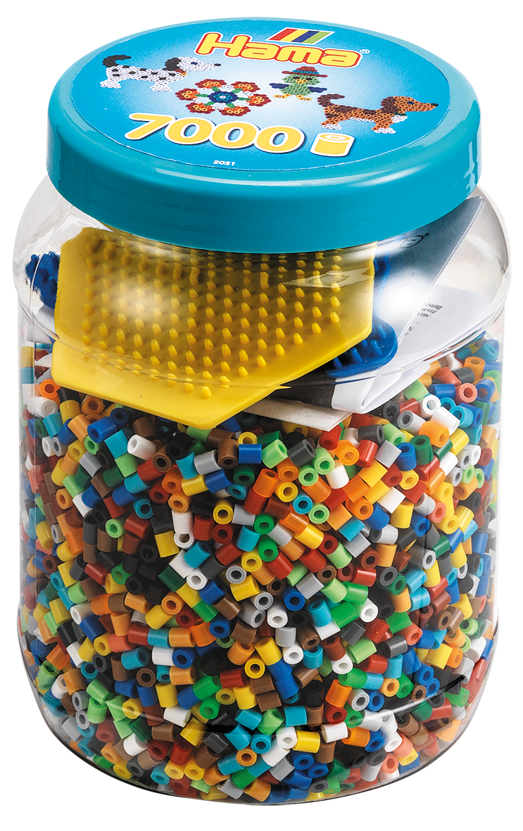Approx. 7.000 beads, 2 small pegboards: Hexagonal No. 223-03 and dog No. 326-09. Colour printed design sheet, instructions and ironing paper.