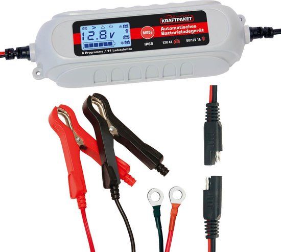 Automatische auto-acculader met batterijtester en druppellading voor alle gangbare batterijtypen: loodzuur, WET, MF, gel en AGM (1.2-120 Ah) Batterijtester: geeft de spanning van de autoaccu aan; werkt bij 12 V auto-batterijen zonder stroomaansluiting; bi