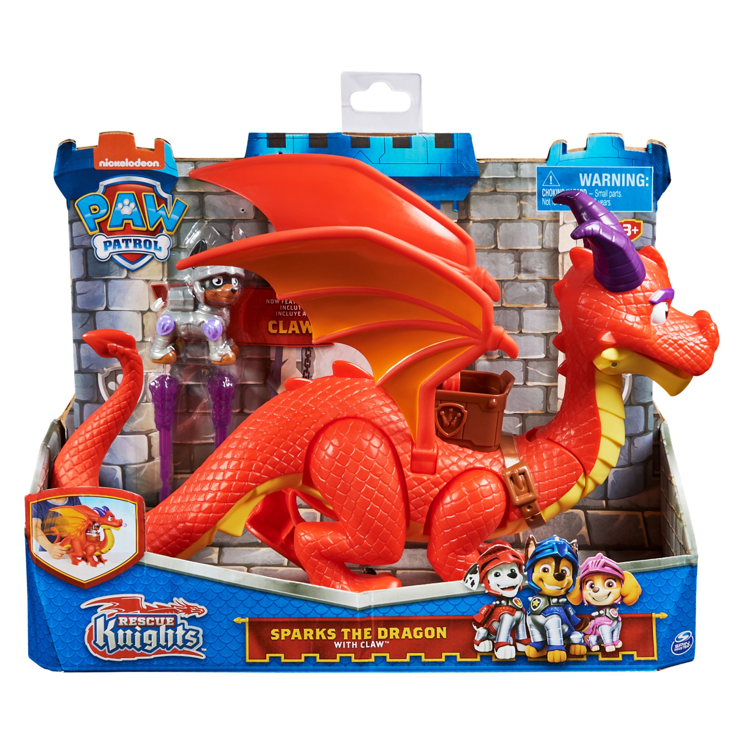 Bereid je voor op middeleeuwse Rescue Knights-missies in Barkingburg met PAW Patrol Draak Sparks en Claw. Deze set actiefiguren bevat een uniek figuurtje van Claw de pup, een grote Draak Sparks-figuur met supervleugels, twee projectielen en een zadel waar Claw op kan zitten. Zowel Sparks als Claw hebben authentieke details en zien er net zo uit als de personages in de tv-serie. Als het tijd is om te vliegen, gebruik je de clip van het zadel om Claw op zijn plaats te houden. Houd Sparks dan vast bij de staart en druk de gebruiksvriendelijke knop op zijn staart in om zijn supervleugels te laten bewegen. Laat je draak en pup rondvliegen, net als in de tv-serie, en druk op de hoorns van Sparks om de 'vuuradem'-projectielen te lanceren.