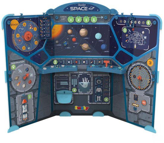 Productgegevens: Leeftijd: vanaf 3 jaar Welkom in de ruimte station : het drievleugelige Smoby Space centrum is rondom bespeelbaar en biedt ongelooflijke speelmogelijkheden. Hier leren en spelen kinderen in de ruimte Alleen of met vriendjes, kinderen verkennen verre sterrenstelsels, leren Planet ensystems en spelen astronautje In totaal 15 verschillende speelmogelijkheden met bijpassende accessoires bieden een grote verscheidenheid aan entertainment Het Smoby Space centrum bestaat uit drie vleugels gemaakt van hoogwaardige kartonnen onderdelen en omsloten door een stevig Metal frame. Na het spelen kan de ruimte station weer worden opgeborgen om ruimte te besparen De voorkant toont de binnenkant van een ruimteschip, de buitenkant een raket in de ruimte De set bevat meer dan 60 accessoires: Planet , ruimte, ruimtepuin, klittenbandpijlen, sterrenbeelden, badges, enz. De accessoires/kaarten zijn voorgesneden uit karton en kunnen worden opgehangen met klittenband Afmetingen en gewicht: Afmetingen in gemonteerde toestand (lengte x breedte x hoogte): 135 x 41 x 111 cm. Materiaal & verzorging: Materiaal: Plastic