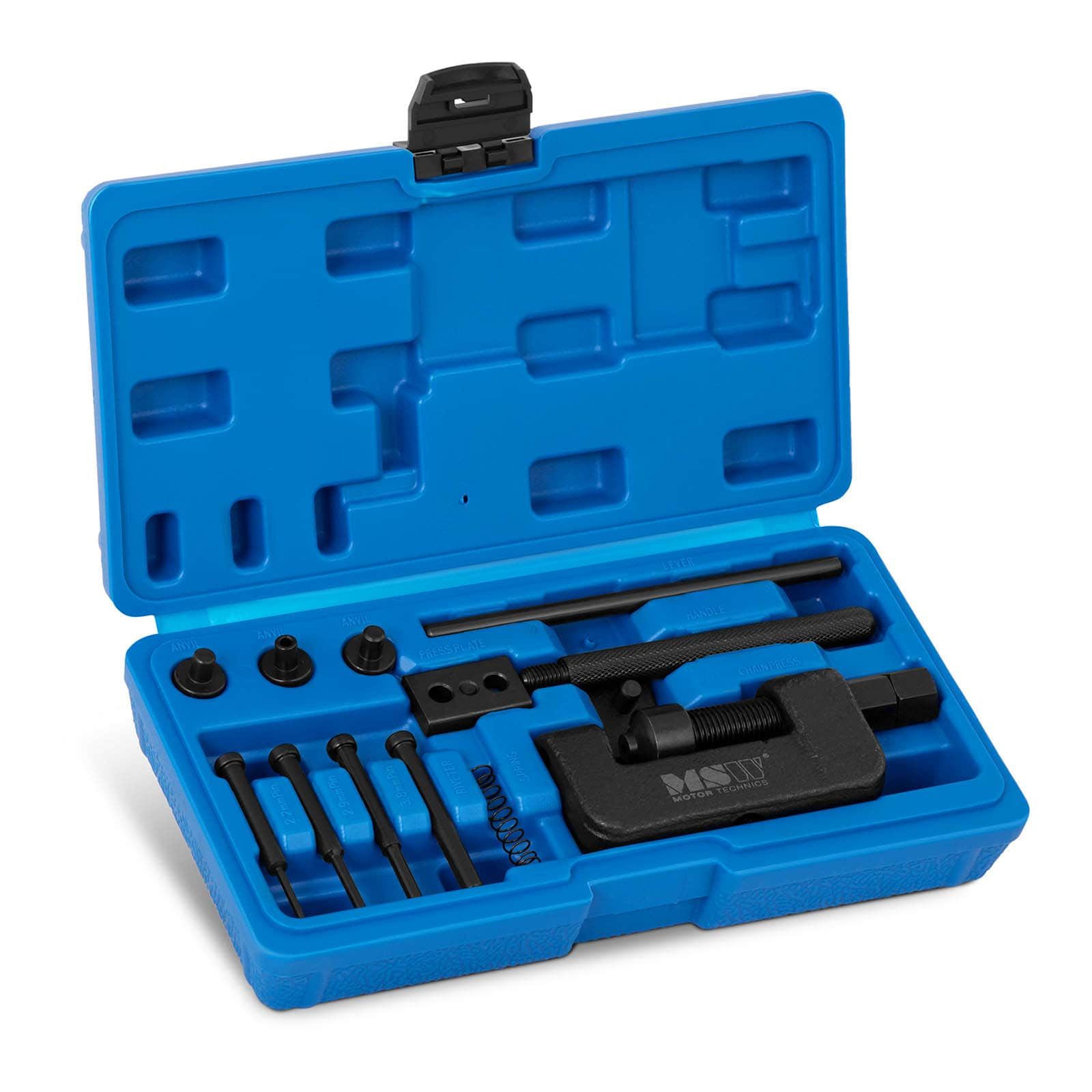 Gebruik het klinkgereedschap van MSW om aandrijf- en distributiekettingen handmatig te scheiden en vast te klinken. De handige voertuigtool is eenvoudig in gebruik en geschikt voor werkplaatsen en doe-het-zelvers. Het kettingnietgereedschap bevat 3 snijpunten in verschillende maten: 2,2 mm, 2,9 mm en 3,8 mm. Met de tips kunt u aan verschillende kettingen werken, van 35 tot 630. Om kettingen te knippen, selecteert u de juiste tip en bevestigt u de meegeleverde veer. Plaats vervolgens beide in de geleiding van de kettingscheider. Voor een betere grip bevestigt u de meegeleverde handgreep aan het gereedschap. Bevestig nu het klinkgereedschap aan de ketting. Zodra deze op de te scheiden schakels zit, draait u de spanschroef van de kettingscheider vast totdat de kettingpen loskomt. Voor klinken: zodra het nieuwe kettingslot met ringen en lip in de gewenste positie staat, zet u het vast met het distributiekettingklinkgereedschap. Plaats hiervoor de juiste adapter. Klink in de laatste stap de bouten afzonderlijk vast met behulp van de meegeleverde aambeelden. Draai hiervoor de klemschroef weer vast tot de bout vastgeklonken is. Het klinkgereedschap voor motorkettingen is gemaakt van slijtvast Koolstofstaal en heeft een lange levensduur. U ontvangt het gereedschap inclusief een praktische transportkoffer.