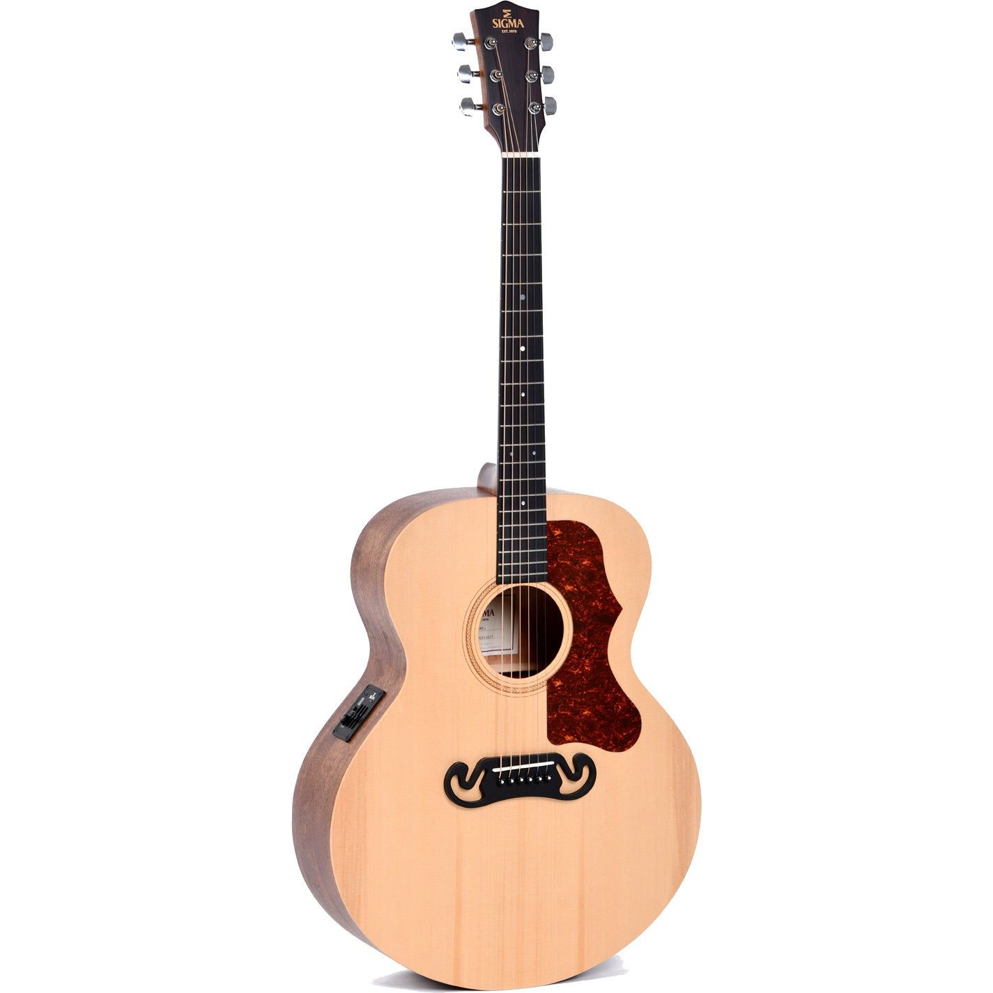De Sigma Guitars GJME is een elektrisch-akoestische westerngitaar met een Grand Jumbo body voor die grootse akoestische gitaarpartijen. Door de aangename low profile hals van mahonie, de donker micarta toets en de aanwezig 20 frets kun je dus rekenen op een hoog speelgemak. Daarnaast is de klank in de basis vertrouwd rijk met een warme afronding in het hoog, doordat de body is opgebouwd uit een massieve Sitka spruce top en zijn de achter- en zijkanten weer van mahoniehout. Ook versterkt komt de klank goed tot uiting dankzij de ingebouwde piëzo en de Sigma Preamp voorversterker met z'n 3-bands equaling voor extra versterkte veelzijdigheid. Kortom, de Sigma GJME is een uitstekende optie voor ieder speelsituatie.