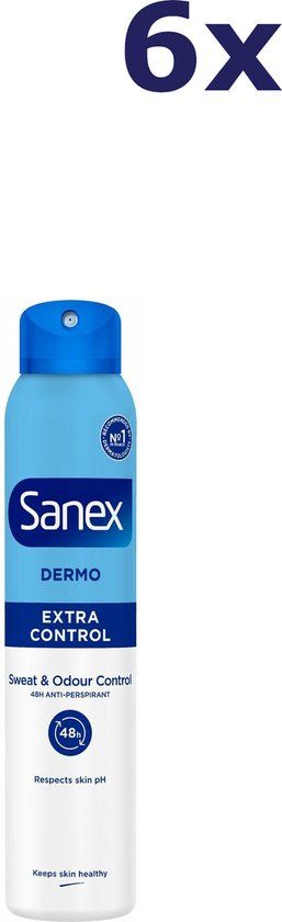 Sanex Dermo Extra Control antitranspirantspray geeft je vertrouwen door effectieve bescherming tegen zweet en geurtjes, tot 48 uur lang. De antitranspirantspray herstelt ook de natuurlijke pH-waarde van je huid. Je kunt de drukste dagen aan wanneer je Sanex Dermo Extra Control anti transpirant deodorant spray gebruikt. Deze anti transpirant spray is speciaal samengesteld om je tot wel 48 uur lang effectief te beschermen tegen zweet en geurtjes, zodat je aan je drukke dag kunt beginnen met één zorg minder. Niet alleen beschermt deze anti transpirant spray je tegen zweet en geurtjes, het verzorgt ook je okselhuid. De anti transpirant spray is dermatologisch getest en speciaal ontwikkeld om de natuurlijke pH-waarde van de huid te herstellen. Houd je okselhuid optimaal verzorgd en gezond met Sanex.