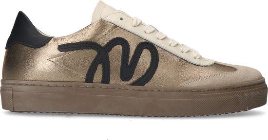 Gouden leren sneakers van Manfield met zwarte, beige en suède details. De sneakers hebben een bruine rubberen zool. We adviseren als verzorging en bescherming de Collonil Carbon Pro.