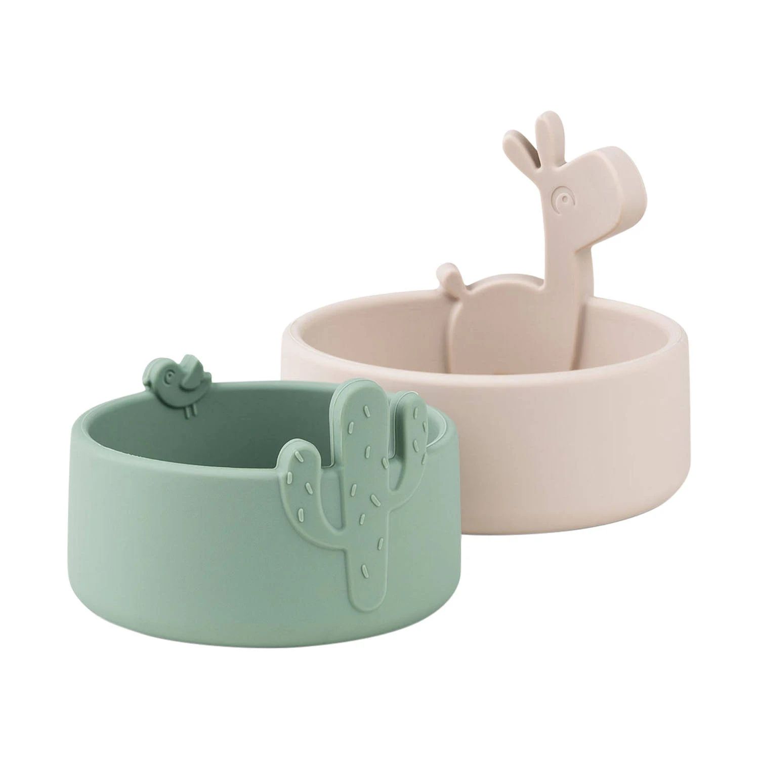 Zorg ervoor dat de snacktijd bedekt is met deze schattige set Lalee-kommen. De leuke elementen die uit de kommen steken, maken van elke snack een favoriete snack. Met een grote hoogte en afgeronde binnenranden is de kom ideaal voor het gemakkelijk grijpen van voedsel. Als de kommen niet in gebruik zijn, passen ze perfect in elkaar. De kom is gemaakt van food-grade siliconen, waardoor hij onbreekbaar en geschikt is voor gebruik in de magnetron, oven, vriezer en vaatwasser en antislip eigenschappen heeft. De kleintjes zullen genieten van het delen van snacks met Lalee en Birdee - maar pas op, Lalee heeft een neus voor snoep en lekkernijen. Op de grote schaal in een zachte zandkleur steekt Lalee uit de rand, terwijl Birdee en een cactus uit de kleine groene schaal springen.