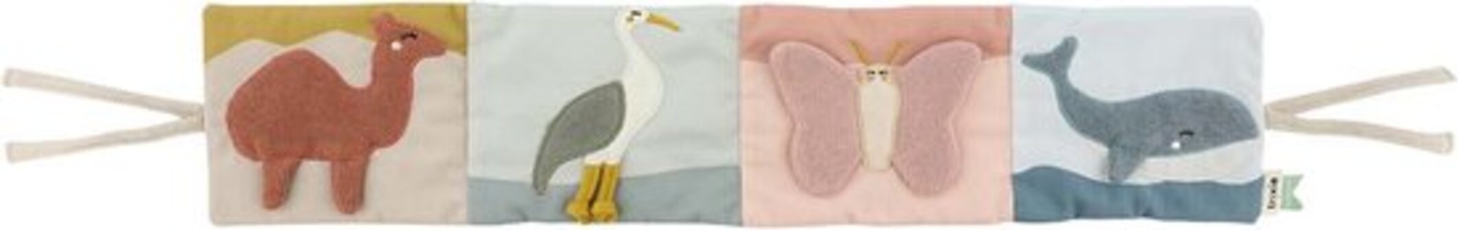 Het park boekje bevat 4 elegante dieren. Elk dier heeft een leuk detail dat baby's kunnen ontdekken. De zachte en serene kleuren in combinatie met de leuke ontdekmogelijkheden zorgen voor perfecte balans tussen de wensen van de ouders en de benodigdheden van de baby. Met de touwtjes aan elk uiteinde van het opengevouwen boek kunnen ouders het gemakkelijk aan de box, het bed of een ander leuk speelplekje bevestigen.