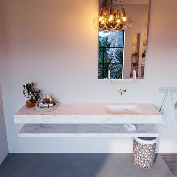 MONDIAZ ALAN DLUXCreëer een fantastische elegante uitstraling in uw badkamer met de badkamermeubel set Alan DLUX. De schitterende badmeubel set ALAN-DLUX bestaat uit een vrij hangende wastafel met zachte organische lijnen van CORIAN in gemarmerd Solid Surface gecombineerd met Solid surface planchet. De badkamermeubel set ALAN-DLUX is geschikt voor iedere badkamer of deze nu klein of groot is. Om uw badkamer helemaal compleet te maken zijn ook diverse accessoires in deze marmers verkrijgbaar. Specificaties badmeubel MONDIAZ ALAN-DLUX Breedte planchet: 200cm Hoogte planchet: 5,8cm Diepte planchet: 41cm Kleur planchet: OstraBreedte wastafel: 200cm Hoogte wastafel: 12cm Diepte wastafel: 46cm Kleur wastafel: Ostra Positie spoelbak: rechts Materiaal: SOLID SURFACE Producent: CORIAN Antibacterieel: JA Maatwerk mogelijk: JA (hiervoor dient contact opgenomen te worden met Sawiday) De CORIAN wastafels zijn in 5 verschillende uitvoeringen met marmer look. Waar u met marmer voorzichtig moet zijn in de badkamer kan in Solid Surface niks intrekken en evt. vlekken kunnen eenvoudig worden schoongemaakt. U heeft dan alle voordelen van Solid Surface en toch de natuurlijke en sfeervolle marmer uitstraling! Het is bestendig tegen vocht.Heeft een naadloze afwerking. Het heeft geen poriën waar vuil in kan zitten. Het is eenvoudig te reinigen. We kunnen het in elk gewenste maat maken. Let op: de kleur TALC en de marmer look van CORIAN zijn door en door solid surface en kan opgeschuurd worden. Alle andere UNI kleuren zijn gespoten en hebben dus een toplaag.