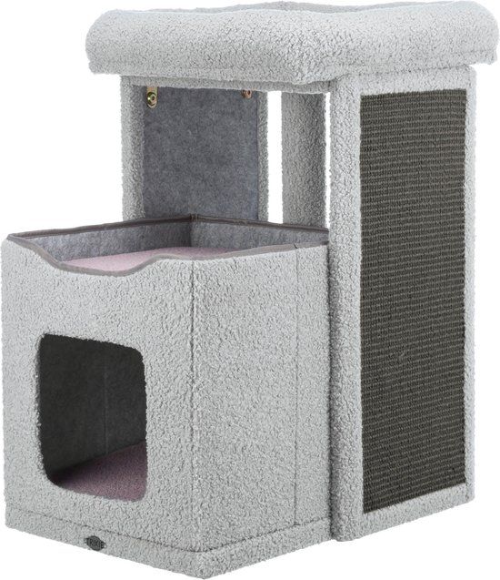 De Trixie Kitten Krabpaal Carlita Grijs/Lila 63 cm is een krabpaal voor kittens in schapenvacht look met schuilplaats en twee ligplekken. Krabben is voor katten een natuurlijke bezigheid: zo houden zij hun nagels bij en markeren zij hun territorium. Om te voorkomen dat jouw kitten zijn nagels leert slijpen aan het meubilair, is het aan te raden veel krabmogelijkheden in huis te hebben. Daarvoor is deze handige krabpaal uitermate geschikt! De paal bestaat uit een schuilplaats, twee ligplateaus en twee panelen met sisal om de nagels aan te scherpen. De schuilplaats is voorzien van een bekleed ligvlak en verwijderbare, omkeerbare ligmat die op de hand gewassen kan worden. Het mandje is voorzien van een comfortabele, gevoerde rand.