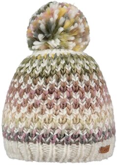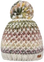 De Nicole is een kleurrijke Barts beanie met pom. De beanie is met fleece gevoerd, voorzien van een rib gebreide boord en afgewerkt met klein leren merkembleem.