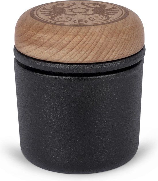 Handvijzel en stamper van gietijzer voor het gemakkelijk fijnmalen van specerijen, noten en zaden. De handvijzel bestaat uit 2 in elkaar passende kommetjes. Het bovenste kommetje is voorzien van een houten deksel waarin je specerijen mee kan nemen.