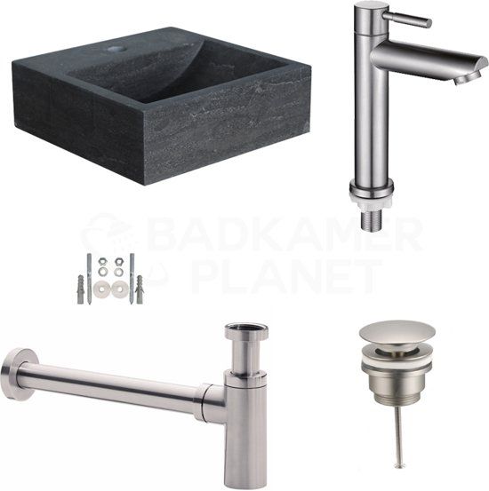 Badkamerplanet Sovana Fonteinset - Natuursteen - 30x30x10 cm - Incl. Kraan, Afvoer en Sifon - Bidetkranen