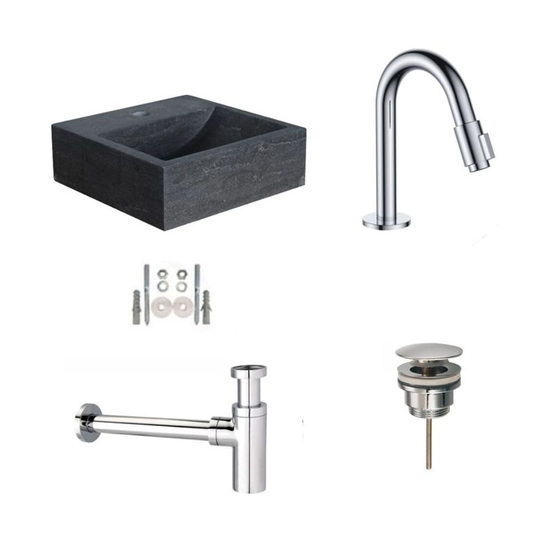 Badkamerplanet Natuursteen Fonteinset Sovana met Elba Fonteinkraan, Afvoer en Sifon Chroom 30x30x10 cm - Bidetkranen