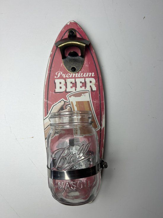 Retroo.nl Rode wandopener met glazen doppen-pot - Flesopener - Hout - Rood