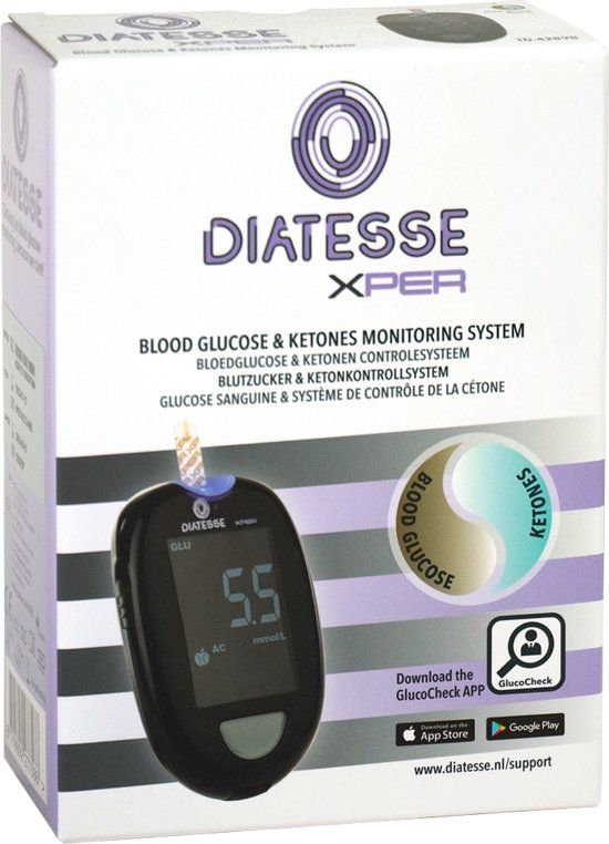 De Diatesse XPER bloedglucose- en ketonenmeter kan bloedglucose en ketonen meten. De nauwkeurige meter werkt door een vernieuwde technologie en is gemakkelijk te gebruiken. De meter heeft een hematocrietbereik van 0-70%, een Bluetooth en USB datakoppeling om gegevens uit te wisselen, een makkelijke strip-uitwerpfunctie en een automatische herkenning van controle vloeistof.