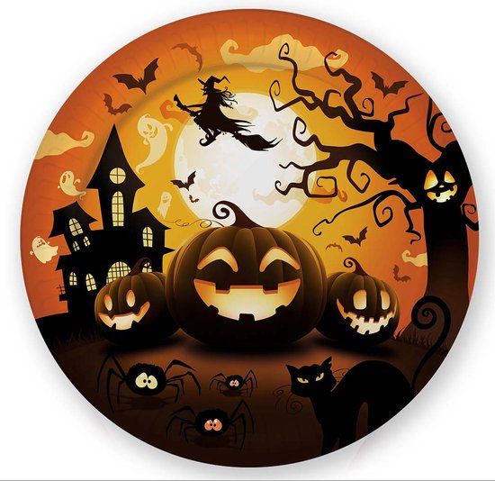 Deze set bevat 6 Halloween pompoenbordjes. Ze zijn gemaakt van karton en hebben een diameter van ongeveer 23 cm. Ze hebben verschillende motieven met het thema Halloween zoals pompoenen, spinnen, vleermuizen, enz., allemaal op een oranje achtergrond en een donkere kant aan de onderkant. Maak je tafelversiering compleet voor je Halloweenfeest!