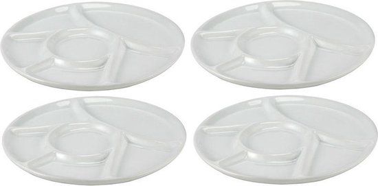 4x Witte fondue/gourmet/bbq borden 22,7 x 1,8 cm 6 vakken. Wit bord met 6 vakjes voor vlees en/of sauzen. Ideaal voor de barbecue, fondue of gourmet. Aantal borden: 4. Materiaal: keramiek. Formaat: ongeveer 22,7 x 1,8 cm. Vaatwasserbestendig: Ja, echter zijn de borden wel zo groot dat handafwas wordt aangeraden. Diner borden met vakken. Vakjesborden voor op de barbecue.
