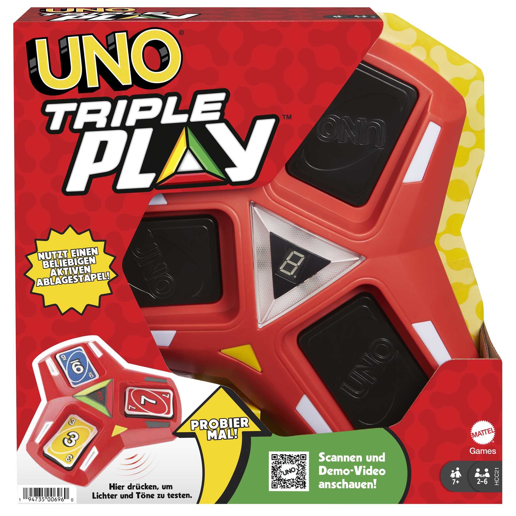 Het spel UNO Triple Play is driedubbel leuk met een speciale kaartenhouder met drie aflegstapels en met meeslepende licht- en geluidseffecten voor meer spanning en sensatie! Je speelt het spel net als het klassieke UNO, maar spelers mogen alleen kaarten afleggen op de stapel of stapels die tijdens hun beurt oplichten. Als er te veel kaarten op een aflegstapel liggen, raakt deze OVERBELAST! Wanneer dit gebeurt, geeft het LED-display aan hoeveel kaarten je moet pakken! Bouw de spanning op met licht- en geluidseffecten die uit de arcadehal lijken ontsnapt. Met de 'timermodus’ drijf je het tempo van het spel nog verder op! Speel het geliefde kaartspel zoals jij en je vrienden het nog nooit hebben gespeeld. Als spelers nog maar één kaart over hebben, moeten ze 'UNO!' roepen Afwijkende kleuren en versieringen mogelijk.