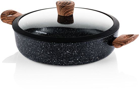 De Westinghouse Zwart Marmer Hapjespan Speciale Editie 28cm mag niet ontbreken aan jouw pannencollectie. De hapjespan is ideaal voor het bereiden van bijvoorbeeld eenpansgerechten, een lekkere risotto, paella of een heerlijke pastasaus. De pan is gemaa