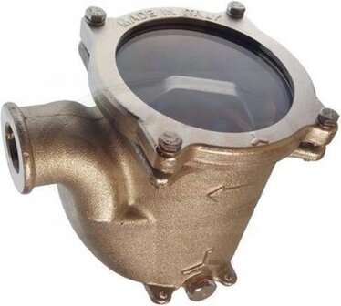Nikkel beplaat, koperen waterfilter voor koelingssystemen. Met filterelement van roestvrij staal AISI-316 en transparant omhulsel voor gemakkelijke inspectie.