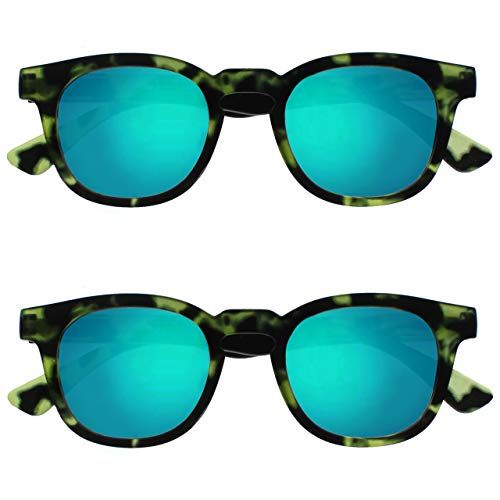 Twee paar stijlvol en koel Mannen / vrouwen / unisex zon lezers leesbril. Om in de zon te lezen (UV400 bescherming, blocks UVA en UVB straals). Dik rond frame ontwerp met veerscharnieren. Makkelijk schoon te maken. Krasvast. Comfortabele pasvorm. Mat groene schildpad afwerking. Gespiegelde lens. Sterkte +1,50.
