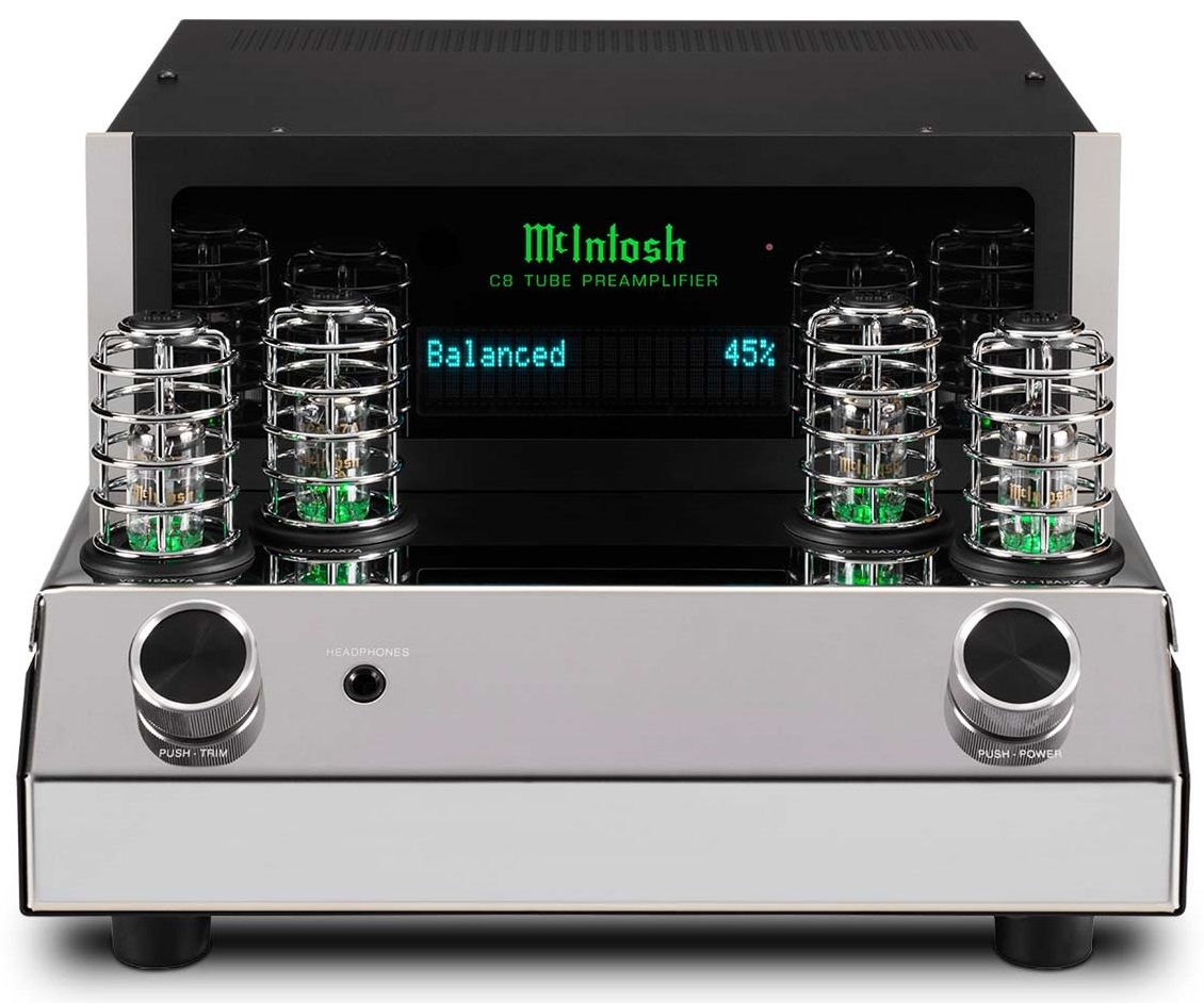 Ingangsselectie, bas, hoge tonen, toonbypass, balans en ingangsverschuivingsniveaus kunnen worden aangepast met de knoppen op het voorpaneel of de meegeleverde afstandsbediening; alle instellingen, het volumeniveau en de ingangsselectie worden weergegeven op het display op het voorpaneel. De C8 zit bovenop een roestvrijstalen chassis dat is gepolijst tot een spiegelafwerking; aan elke kant zijn klassieke naambadges in gegoten aluminium in McIntosh-stijl bevestigd. Het heeft een zwart glazen frontpaneel met zilveren rand, een verlicht logo en draaiknoppen.