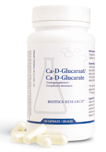 Biotics Ca-D-Glucaraat Capsules is een voedingssupplement op basis van calcium-d-glucaraat. Calcium-D-Glucaraat is het calciumzout van het zuur D-glucaarzuur. Het ondersteunt het glucuronidatieproces, een belangrijke fase-2-reactie in de lever. Aanmaak van glucuronzuur is noodzakelijk voor het neutraliseren en afvoeren van toxines en overmaat aan steroïdehormonen zoals oestrogeen.Dosering2 maal 1 capsule per dag bij de maaltijd. De aanbevolen dagelijkse dosering niet overschrijden. Omdat calcium-d-glucaraat de effectiviteit van de glucuronidatie vergroot, kan het ook de uitscheiding van bepaalde medicijnen versnellen waardoor de werking van die medicijnen vermindert. Interacties met reguliere of natuurlijke geneesmiddelen zijn steeds mogelijk.Waarom is er weinig informatie beschikbaar over dit product?Helaas kan door EU-wetgeving maar beperkt informatie worden geven over dit product. Uitsluitend informatie over goedgekeurde claims die vermeld staan in de EU database mag worden vermeld. Resultaten uit wetenschappelijke onderzoeken die niet ter goedkeuring aan de EU zijn overlegd, mogen daarom niet gedeeld worden.Heeft u vragen over dit product? Neem dan gerust contact op met onze gediplomeerde drogisten voor persoonlijk advies.