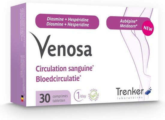 Trenker Venosa Bloedcirculatie¹ ³⁰tabs bevat een gemicroniseerde diosmine van de derde generatie, op basis van hesperidine uit bittersinaasappel. Het unieke productieproces verbetert de opname van diosmine door het lichaam met ⁹⁴⁰% in vergelijking met standaard gemicroniseerde diosmine. Laat bloedcirculatie of ook wel genoemd de bloedsomloop één van de meest belangrijke functies zijn in het lichaam. Het gevoel van zware benen kan iedereen treffen. Het kan te wijten zijn aan een gevoel van vermoeidheid en worden veroorzaakt door andere factoren, zoals erfelijkheid, ouder worden, hormonale veranderingen, hitte, langdurige statische houdingen, enz. In het algemeen worden vrouwen vaker getroffen, dit komt echter ook voor bij mannen. Verwijzingen: ¹Meidoornextract draagt bij tot een goede bloedcirculatie.