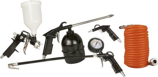 ATM1036 FERM Luchtgereedschapset 5 delig: Luchtpistool, 5 meter krulslang, Bandenvuller met drukmeter, Vlloeistofspuit, Verfspuit met bovenbekler; universeel toepasbaar. DIN / Orion. Complete startset voor meeste klussen!