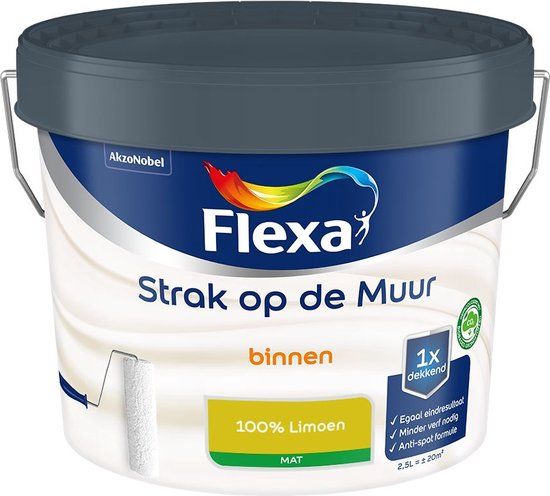 Strak op de Muur is een kwaliteitsmuurverf die in 1x dekt met een matte finish. In een handomdraai geef je al je muren en plafonds een prachtige, nieuwe look in iedere gewenste kleur. Strak op de Muur wordt geproduceerd met biobased ingrediënten. De Flex