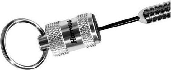 Sleutelhanger met slijpsteen, voor het verwijderen van bramen van de metalen punt van een steeltip dart die ontstaan door het raken van het ijzerwerk op/in het steeltip dartbord. Bramen beschadigen het sisal van het bord.
