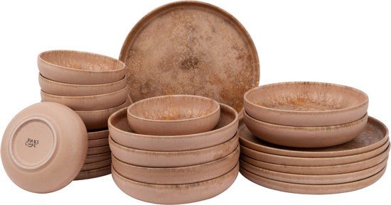 Compleet 24-delig servies: Bevat 6 dinerborden (28 cm), 6 ontbijtborden (22 cm), 6 diepe borden (22 cm) en 6 schalen (16 cm, 60 cl), ideaal voor dagelijks gebruik en speciale gelegenheden. Hoogwaardig stoneware materiaal: Gemaakt van duurzaam stoneware me