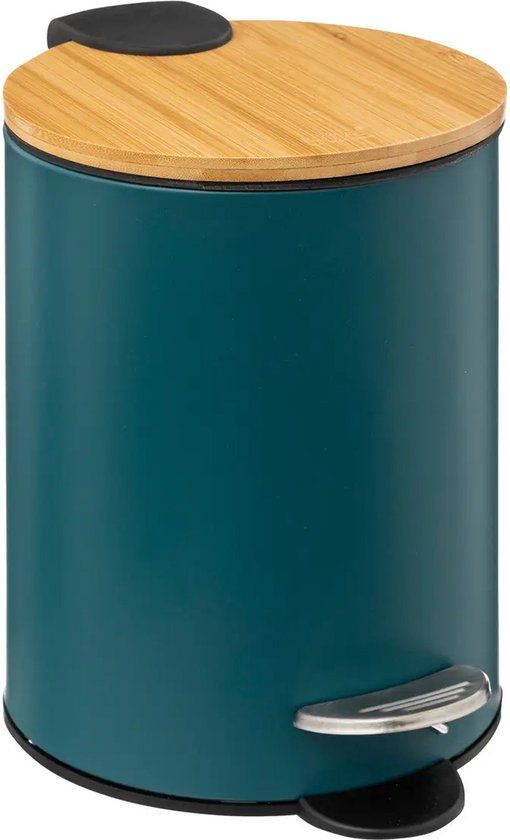 Five metalen vuilnisemmer, 3 l, petrol en bamboe deksel Afmetingen: D 17 cm x H 24 cm – dikte van het deksel van bamboe: 7 mm – Materiaal: metaal en bamboe – inhoud = 3 l – geluidsarme sluiting – gewicht: 0,640 kg Model: smaragdgroen