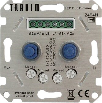 Bekijk productTradim LED Dimmer DUO inbouw - 3-100W - Fase afsnijding - Hotelschakelaar functie - Dimmerschakelaars