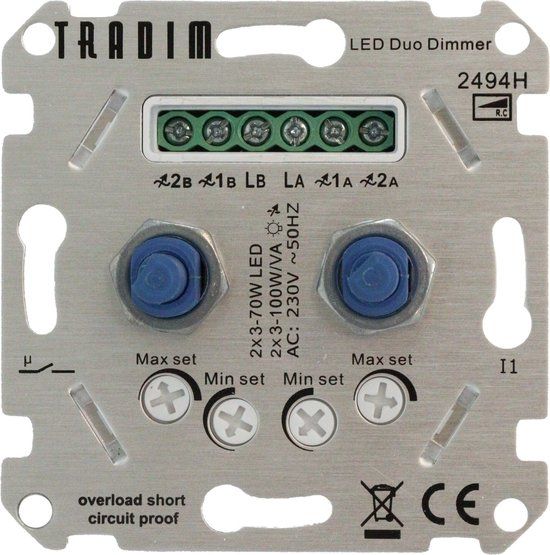 Tradim LED Dimmer DUO inbouw - 3-100W - Fase afsnijding - Hotelschakelaar functie - Dimmerschakelaars