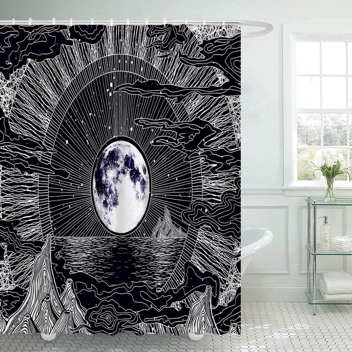 Ulticool Douchegordijn - Maan Sterren Natuur Wolken Bohemian Psychedelische bergen - 180 x 200 cm - Zwart - Douchegordijnen