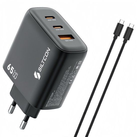 Siltcon 3-in-1 Snellader USB-C 65W - USB C Adapter - Geschikt voor Snellader Samsung - Oplader USB-C - 2x USB-C PD 65W - 1x USB-A PD 22.5W - GaN - Universeel o.a. Telefoons, Laptops - 2 Meter 65W USB-C Snellaadkabel - Draadloze opladers