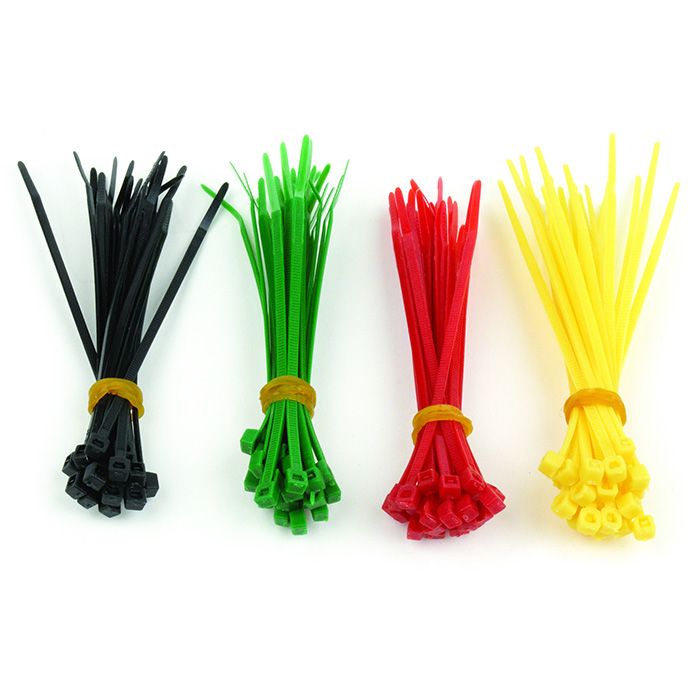 - Nylon cable ties\n- Self-locking, non-releasable lock\n- 100 mm length, 2.5 mm width\n- 4 colors: black, red, yellow, green x 25 pcs each color\n- Bag of 100 pcs
