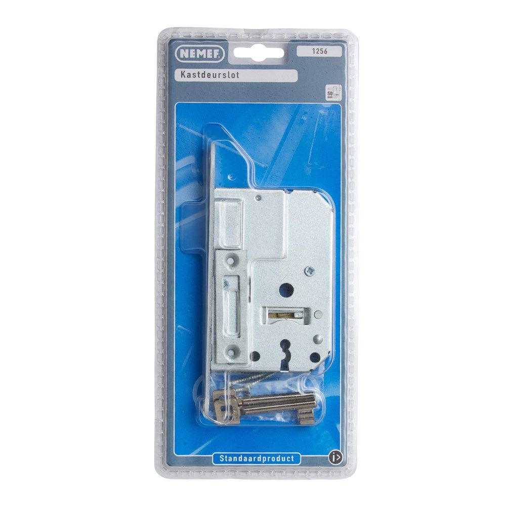 Nemef kastslot 1256/2 - Doornmaat 50mm - Wit gelakte voorplaat - Met sluitplaat - Met sleutels - Met bevestigingsmateriaal - In zichtverpakking - Draadstrippers