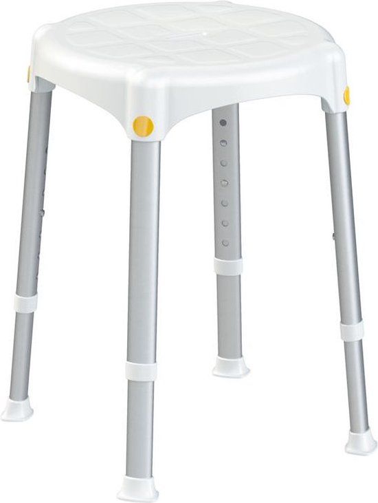 De douchekruk rond Capri is een stevige douchekruk. Dankzij deze douchekruk kunt u zich comfortabel en veilig douchen. Handig wanneer u bijvoorbeeld niet lang kunt blijven staan. Omdat het douchekrukje erg compact is het ook goed te gebruiken in kleinere doucheruimtes en douchecabines. Bovendien is de douchekruk lichtgewicht zodat u het gemakkelijk kan verplaatsen. Bijvoorbeeld wanneer een huisgenoot gebruik wil maken van de doucheruimte. U kunt de zithoogte van het douchezitje eenvoudig aanpassen en hiermee de juiste hoogte kiezen die voor u het meest comfortabel is. De sleuf in het midden van de zitting zorgt ervoor dat het water optimaal wordt afgevoerd. Doordat de poten zijn voorzien van stevige rubberen antislip doppen staat de kruk stabiel en zal deze ook op de natte ondergrond van de douchecabine niet verschuiven. Dit zorgt voor optimale veiligheid in uw doucheruimte.