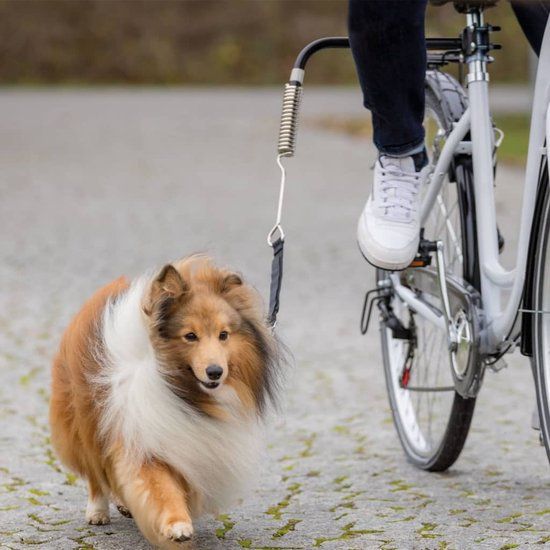 - also for large and heavy dogs\n- for safe leashing on a bike\n- particularly robust\n- sudden tugs by the dog are softened by the integrated spring\n- safety appliance with Velcro: short leash detaches in the event of a sudden jerky tug\n- distance spacer with reflective stripe\n- consists of distance spacer with holder for saddlebar, short leash and spiral spring