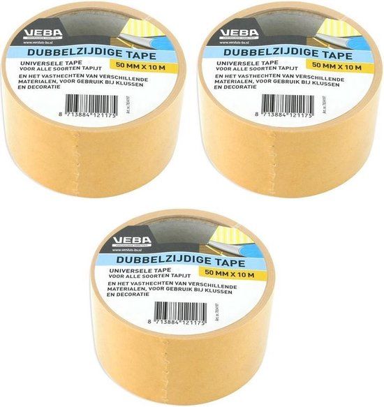 3x Dubbelzijdig tape / tapijttape bruin 50 mm x 10 m. Rol met dubbelzijdig tape. Geschikt om tapijt op zijn plaats te houden, of voor het bevestigen van lichte voorwerpen aan muur of plafond. Het dubbelzijdige tape is ongeveer 50 mm breed en 10 meter lang. Formaat: ongeveer 50 mm x 10 m. Dubbelzijdig tape voor bevestigen/klussen in huis. U ontvangt 3 stuks.