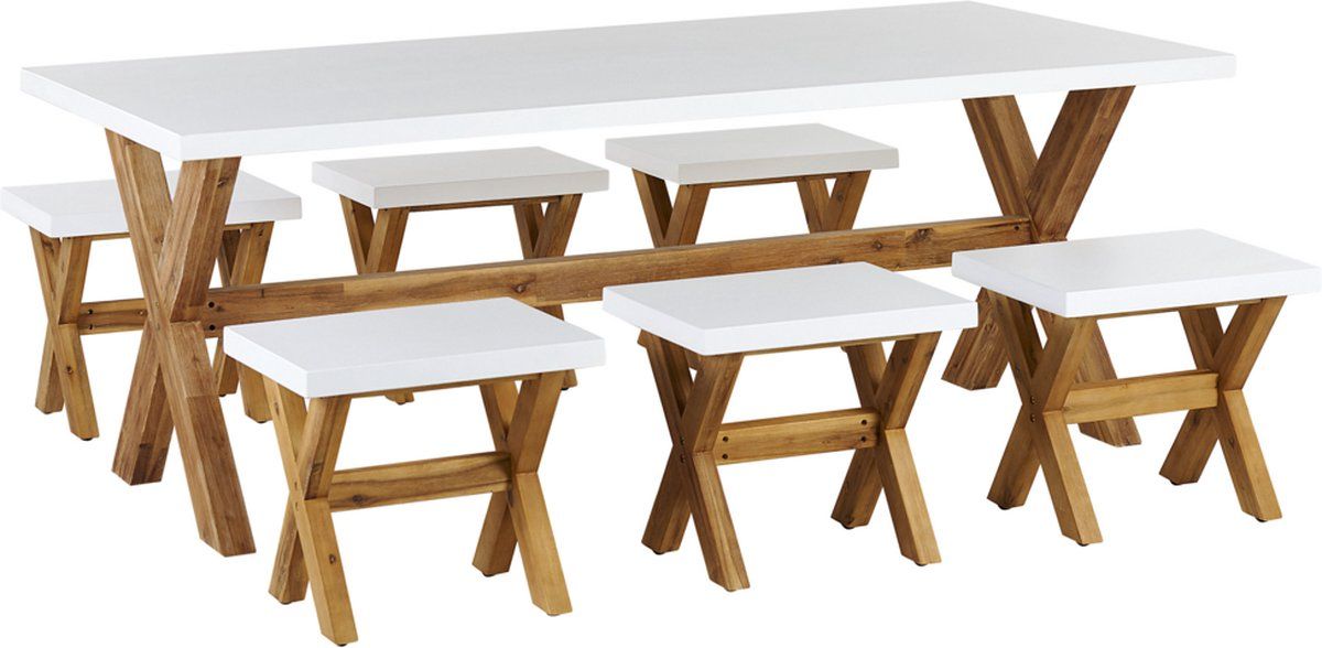 Modern tuinset met tafel en zes stevige krukken van vezelcement. Deze tuinset geeft je een fijne eethoek in je tuin of op je terras. Perfect voor een gezellig familieontbijt of een brunch met vrienden. Aan de grote tafel met de bijpassende krukken is genoeg ruimte voor zes personen. Alle onderdelen van dit tuinset zijn gemaakt van onderhoudsvriendelijke, duurzame en weerbestendige materialen. Het tafelblad en de stoelen zijn gemaakt van vezelcement, de stevige onderstellen van het meubilair zijn gemaakt van acaciahout.Details: Producttype: Tuintafelset Stijl: Modern Kleur: Wit Soort materiaal: Beton Hoofdmateriaal: Vezelcement Overig materiaal: Acaciahout Materiaal bovenkant: Beton Afwerking: Gelamineerd Afmetingen: Afmetingen stoel: 51x40x45 cm Hoogte zitting: 45 cm Afmetingen tafel: 200x100x75 cm Algehele afmetingen: