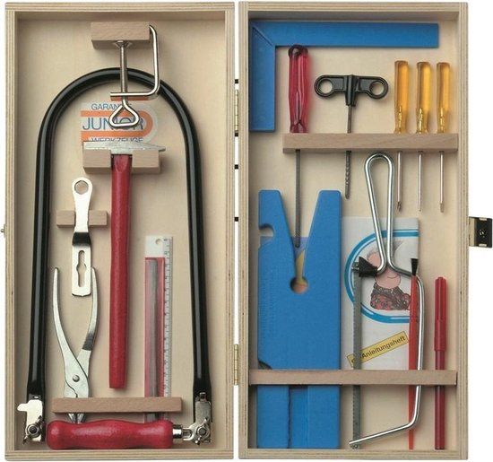 Een complete figuurzaag set, geschikt om kinderen te leren zagen. De set bestaat uit alle gereedschappen welke u nodig heeft met figuurzagen, o.a.: een figuurzaagje met houtzaagje, een houten plankje met klem, een vleugelmoersleutel, een houtboortje, een priem, een liniaal, een ronde vijl, een kwastje, een potlood, een klein zaagje, schroevendraaiers en een gebruiksaanwijzing. Hobby/knutselbenodigdheden - Figuurzagen - Figuurzaag - Leren zagen/boren voor kinderen/jongens/meisjes.