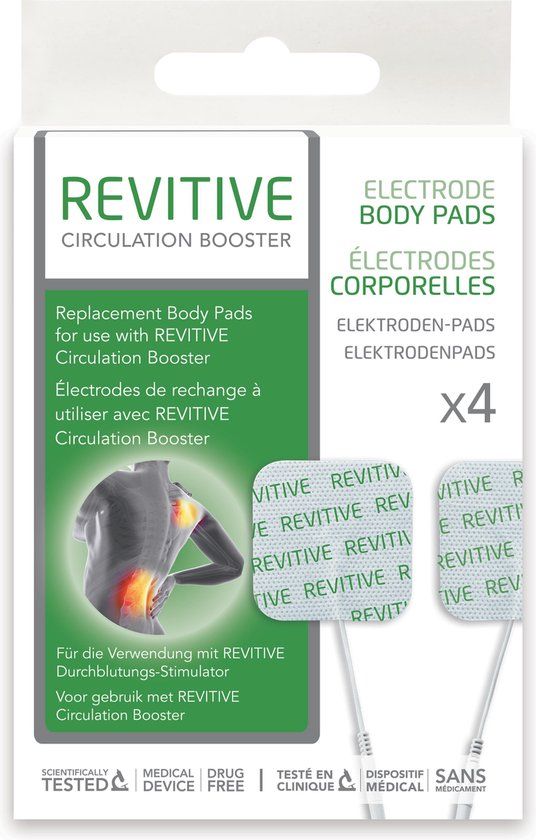 REVITIVE Electrode Body Pads can be used with REVITIVE Medic, Advanced, IX, CX & LV.\n\nWhen used with REVITIVE, the Electrode Body Pads apply Electrical Muscle Stimulation (EMS) to stimulate the nerve endings causing the muscles to gently contract. The pads allow targetting of specific areas of the body, such as lower back, upper back, knees, thighs & arms.\n\nReusable up to 20 – 30 applications\nEasy to apply\nCan also be used with the Original Circulation Booster v3