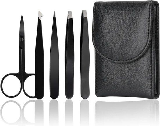 Maak kennis met de ultieme epileerset! Deze vijf-delige set bestaat uit vier verschillende soorten zwarte pincetten en een zwart schaartje, en is ontworpen om jouw epileerervaring naar een hoger niveau te tillen. De pincetten hebben elk een unieke vorm, waardoor je met gemak zelfs de kleinste haartjes kunt pakken. Het schaartje is perfect voor het trimmen van wenkbrauwen en andere gezichtshaarplekken.
