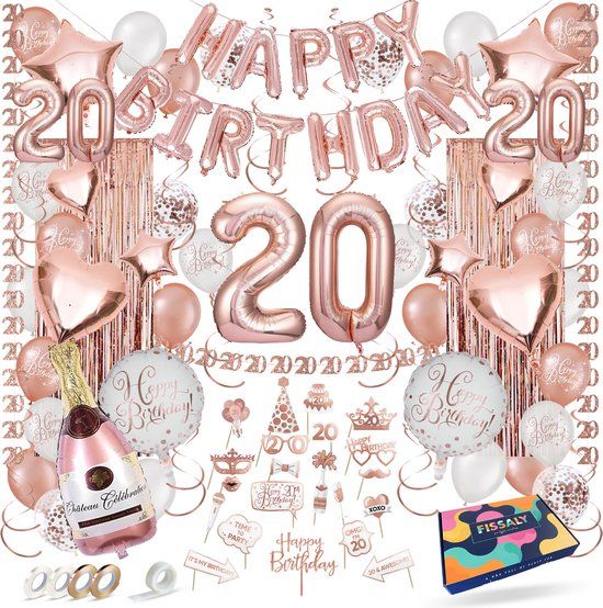 20 jaar, wat gaat de tijd toch snel! Vier dit jaar je mooie leeftijd extra goed met de unieke decoratie set van Fissaly®. In deze set zit alles inbegrepen om je verjaardag een succes te maken en een onvergetelijke dag te beleven!