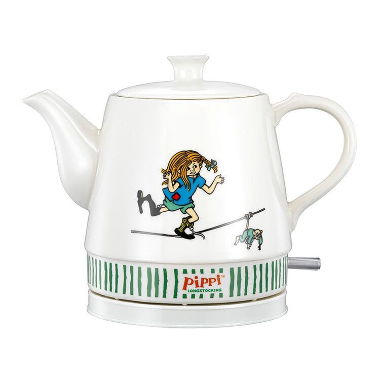 Deze waterkoker uit onze Pippi Romance-serie is ontworpen met een romantisch Zweeds geïnspireerd ontwerp. De Romance waterkoker heeft een volledig keramische behuizing die perfect past bij de Pippi-universum kopjes, borden, enzovoort en is geschikt om direct op tafel te presenteren als een charmante serveerpot. Het kleurrijke en vrolijke ontwerp nodigt uit tot gezellige middagen met dampende thee en gezellige gesprekken met dierbaren. De waterkoker is wit en heeft verschillende Pippi-illustraties waaruit je kunt kiezen. Met een waterreservoir van 0,8 liter kun je gemakkelijk genoeg water opwarmen voor je thee- of koffiemomenten. De waterkoker is uitgerust met een 360° draaibare voet, waardoor je de waterkoker eenvoudig kunt plaatsen en oppakken vanuit elke hoek.Veiligheid is ook gegarandeerd met de droogkookbeveiliging, waardoor de waterkoker automatisch uitschakelt wanneer er geen water meer in het reservoir aanwezig is. De keramische behuizing geeft niet alleen een