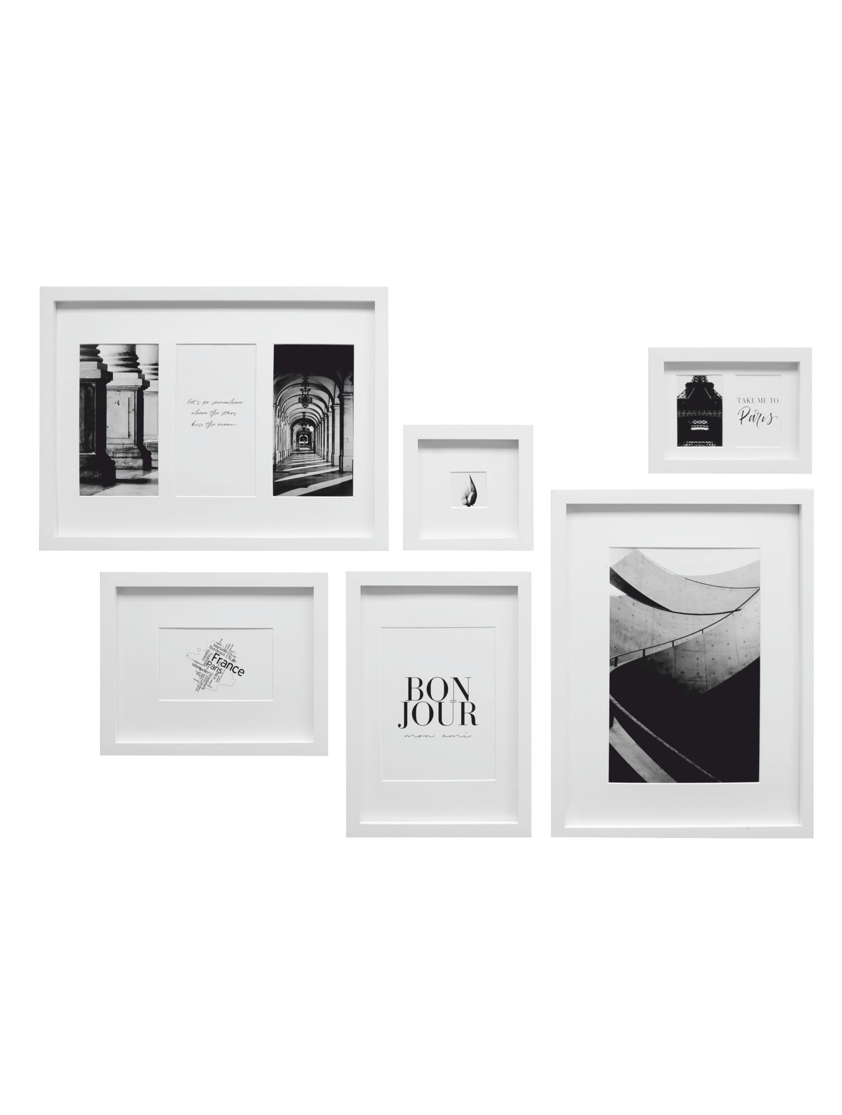 Creëer jouw eigen fotowand met deze set van 6 witte fotokaders. De formaten van de kaders zijn : 13x13cm, 13x18cm, 20x25cm, 20x30cm en 30x40cm (2x). Totale afmeting van de voorgestelde combinaties is 68x95cm.