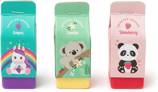 Deze set heeft de vorm van kleine melkpakken met schattige en kleurrijke illustraties en bevat gummen met de geur van druiven, aardbeien en vanille om plezier te maken op school, op kantoor en thuis.