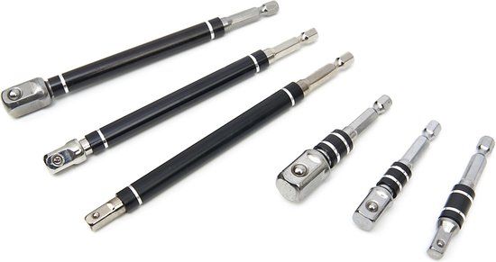Deze 6 delige set met professionele adapters is een belangrijk hulpmiddel voor gespecialiseerde vakmannen. Alle adapters hebben eenzelfde aansluiting, zodat je ze gemakkelijk op een boormachine of automatische schroevendraaier bevestigt. De adapters bestaan uit hoogwaardig metaal waardoor ze niet buigen, breken of slijten bij intensief en dagelijks gebruik. De set wordt geleverd in een handige opbergcassette.